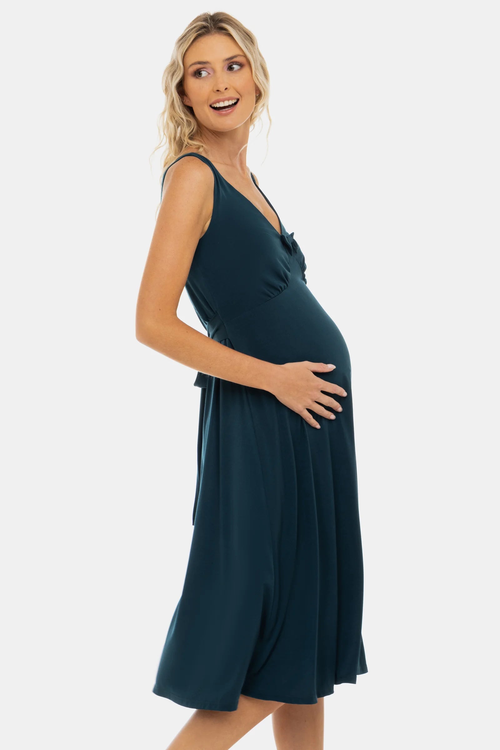 Luchtige zwangerschapsjurk met plooien en strikdetail – teal
