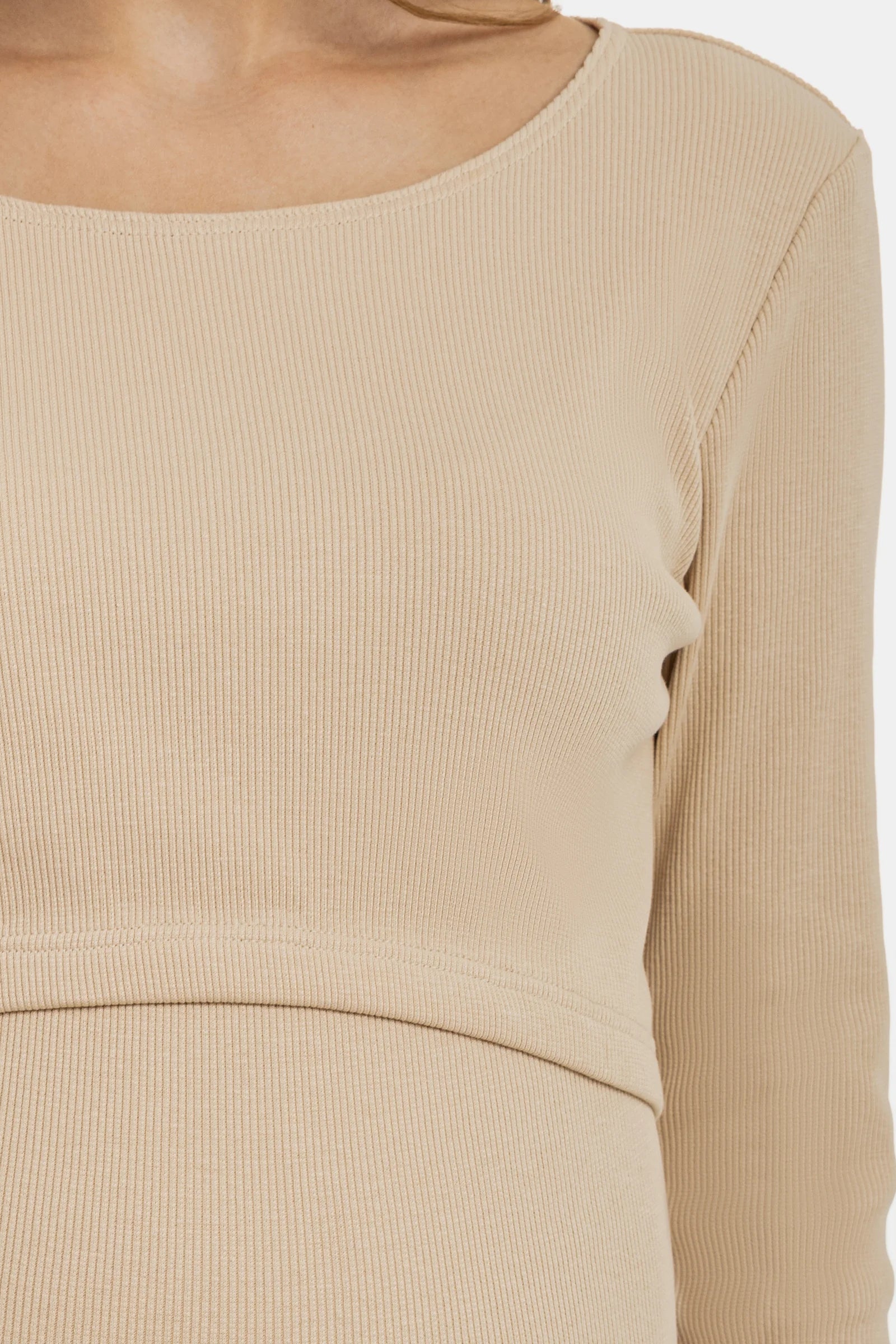 Lange rib zwangerschaps- en voedingsjurk met lange mouwen - sand