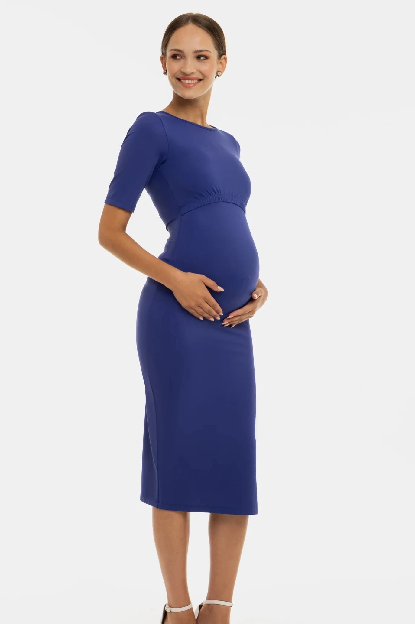 Lange blauwe zwangerschaps- en voedingsjurk van travelstof