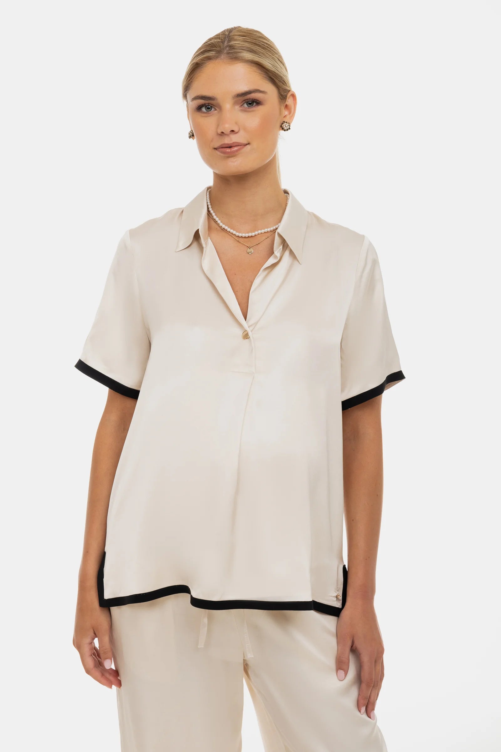 Satijnen zwangerschaps- en voedingsblouse met contrastbiezen